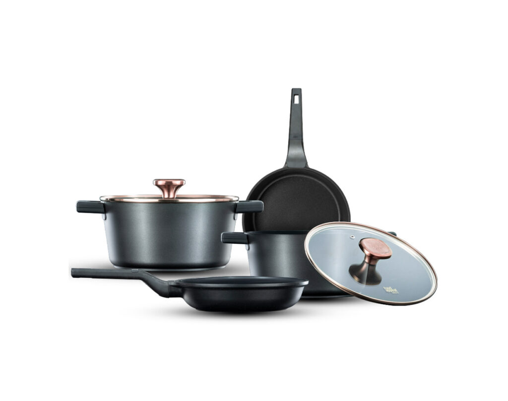 מארז כלי בישול 6 חלקים – סיר 20/24, מחבת 20/24 ס”מ ARISTO ידית רוז גולד מבית Food appeal