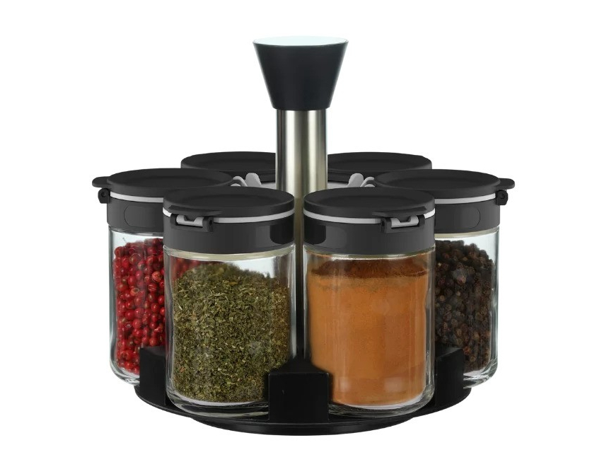 מעמד תבלינים מסתובב עם 6 צנצנות זכוכית מסדרת roso Toolz
