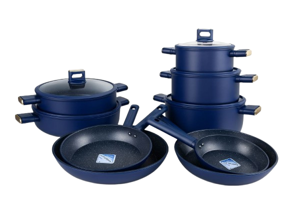 הכירו את הסט שישדרג כל ארוחה! בצבע כחול נייבי עמוק ואלגנטי, עם גימור ידיות זהב, וציפוי שיש נון-סטיק מהפכני. זה לא רק כלי בישול – זו הצהרה עיצובית!