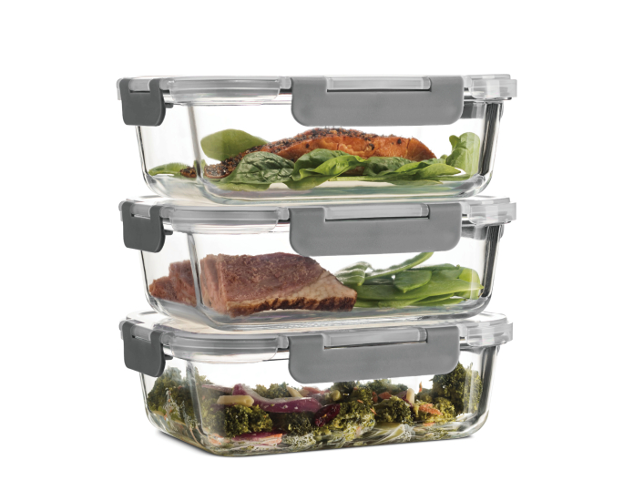 סט 6 חלקים: 3 קופסאות עם 3 מכסים בצורה מלבנית מתאימים להכנת ארוחות, ולכל צרכי אחסון המזון.