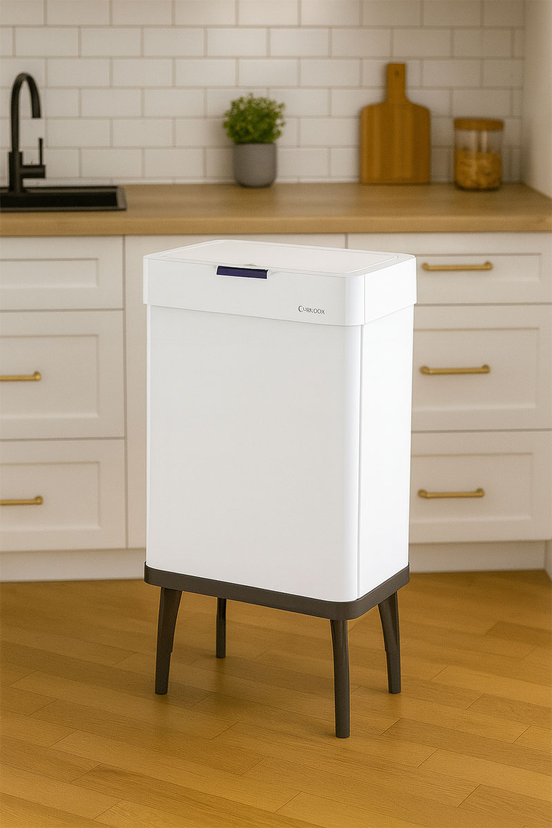 פח אשפה חכם למטבח מנירוסטה בנפח 60 ליטר בעל חיישן תנועה חכם הניתן לתזוזה של 90 מעלות הפותח וסוגר את הפח אוטומטית