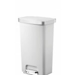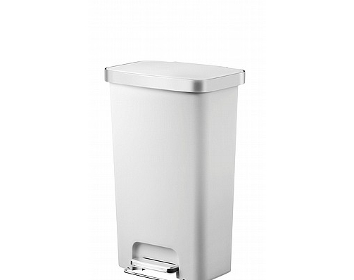 פח אשפה 45 ל’ מלבני פלסטיק לבן עם פס נירוסטה כסוף.